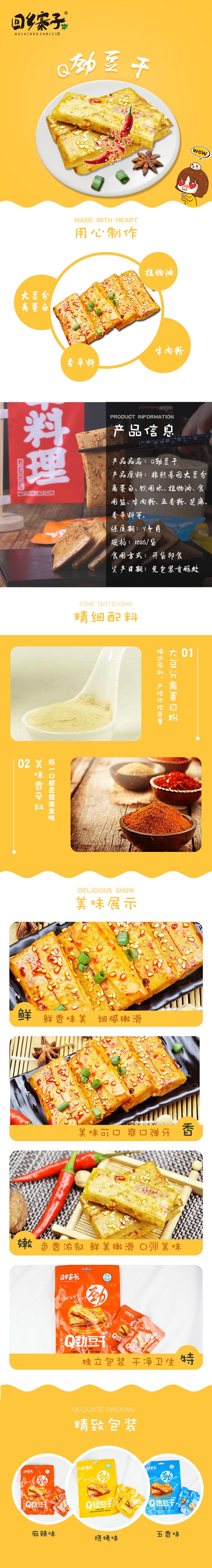 本品采用優(yōu)質(zhì)大豆分離蛋白粉為主料,輔以香辛料調(diào)味。經(jīng)低溫發(fā)酵、切片、鹵制、烘烤拌料、121°高溫?cái)?shù)道工藝加工而成,保持豆制品特有的香味,后勁香醇,韌性好,嚼勁足,老少皆宜。